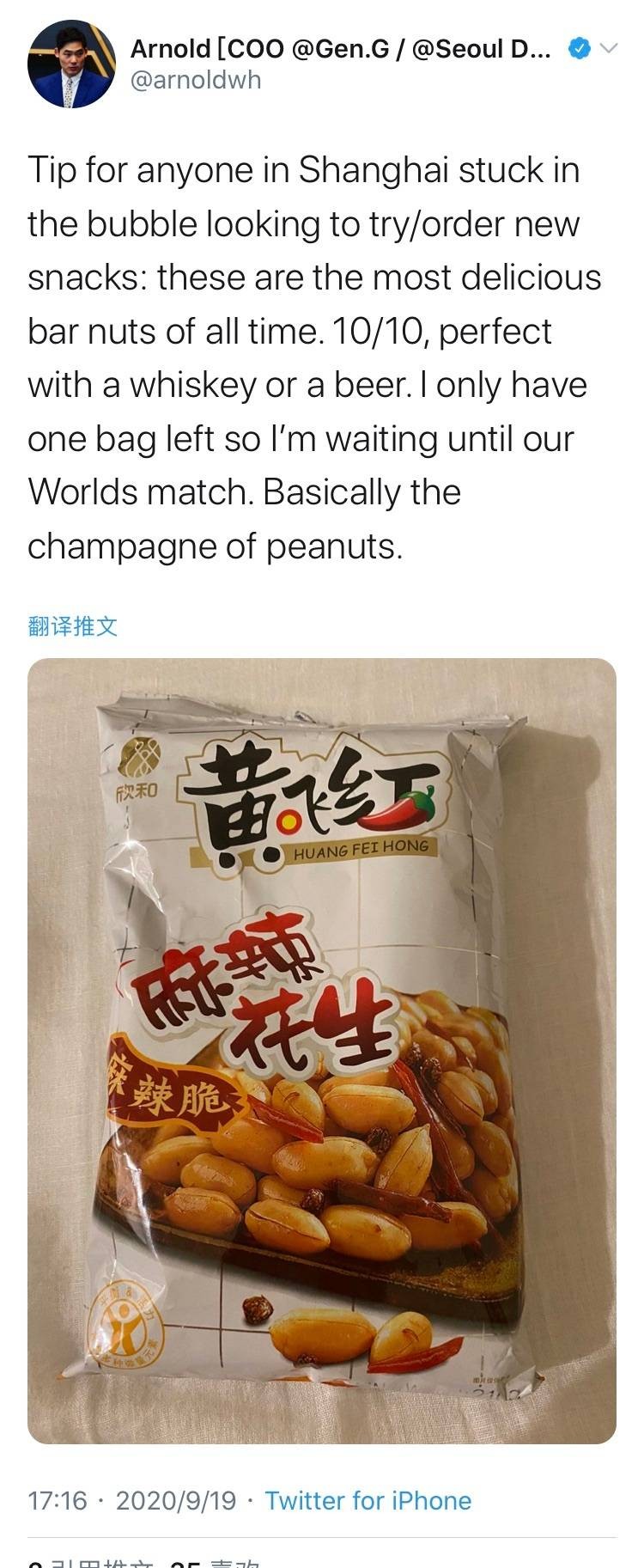 直播吧9月19日讯 今日,GENG COO更推推荐中国零食麻辣花生,表示是所有坚果零食中最好吃的,可完美搭配威士忌或啤酒。
