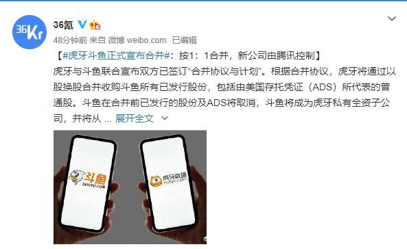 【#虎牙斗鱼正式宣布合并#:按1:1合并,新公司由腾讯控制】