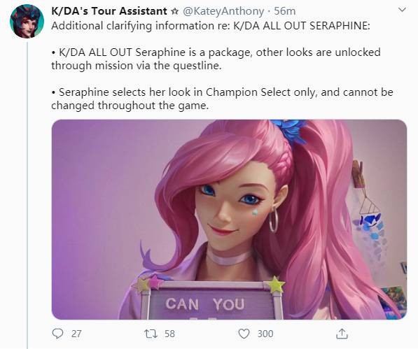 “K/DA ALL OUT 萨勒芬妮是一个整体的皮肤包,除了初始形态之外其他的形态需要靠做任务解锁。萨勒芬妮的终极皮肤只在英雄选择界面中选择具体形态,并且不能在游戏中改变形态。”