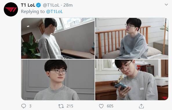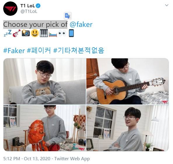 直播吧10月13日讯 S10世界赛正在如火如荼的进行中,今日无缘参赛的T1更新推特发布了Faker的日常生活照并配文:“选你喜欢的”