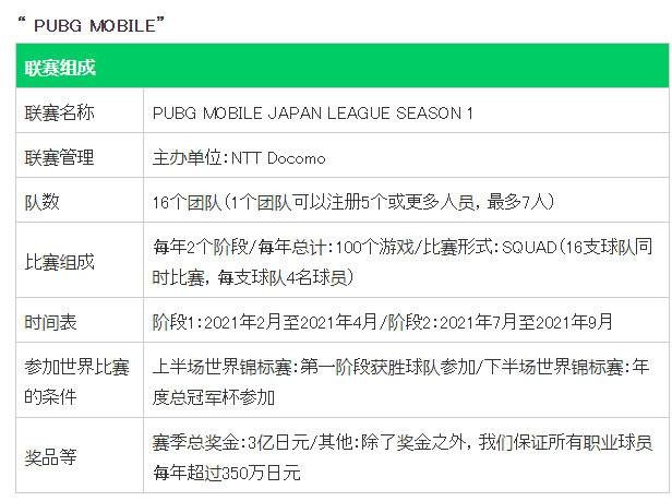 直播吧11月5日讯 今日,电信运营商Docomo进入日本电竞行业,宣布PUBGM日本联赛总奖金池3亿日元,承诺职业选手除了奖金池外年收入不少于350万日元。