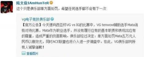 15年德玛西亚杯 VGvsIG 的比赛中,VG辅助选手 Mata 单手操作辅助杰斯消极对待比赛,而后VG俱乐部微博发布公告罚款Mata五万人民币。(Mata当时在VG的队友之一就是死亡宣告)