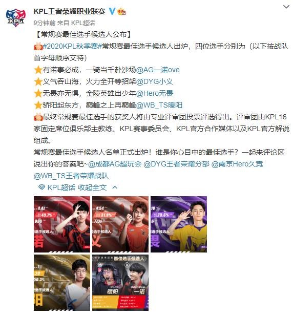 直播吧11月23日讯 今日,KPL王者荣耀职业联赛官博公布了2020KPL 秋季赛常规赛最佳选手候选人名单,分别是成都AG超玩会_一诺、DYG_小义、南京Hero久竞_无畏、WB.TS_暖阳。