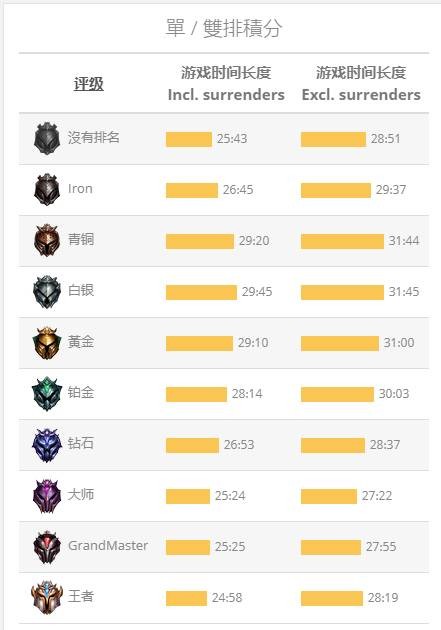 包含投降的各段位游戏时长:白银的游戏时间最长,高达29分45秒;