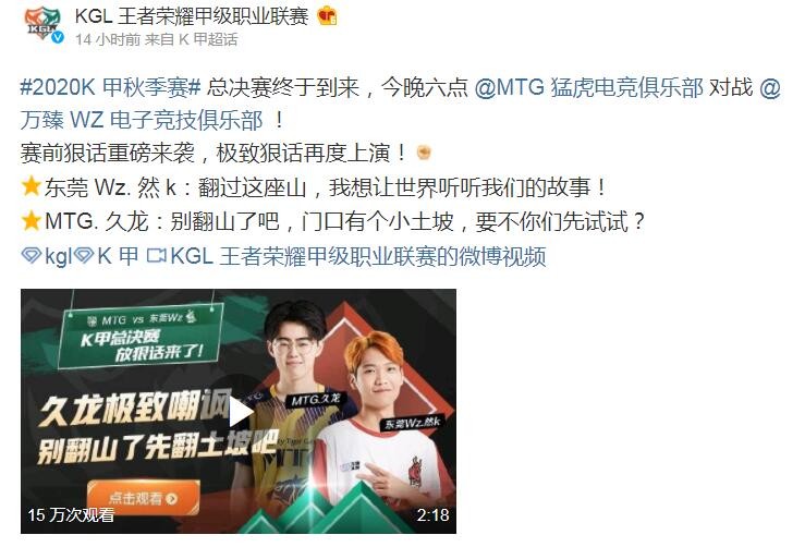 直播吧12月12日讯 在今天,2020王者荣耀KGL甲级职业联赛秋季赛总决赛MTG vs WZ的比赛前,官方发布了赛前垃圾话环节视频,其中WZ战队的然K选手套用了2018年英雄联盟S8 IG的夺冠台词:翻越这座山,我想让世界听听我们的故事。