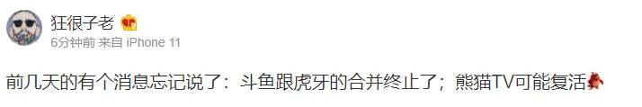 “前几天的有个消息忘记说了:斗鱼跟虎牙的合并终止了;熊猫TV可能复活”