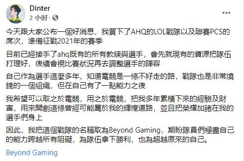直播吧1月27日讯 今日,前TPA、HKA选手DinTer更新Facebook宣布收购AHQ的PCS席位。