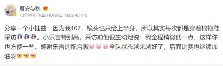 因为我167,镜头也只给上半身,所以其实每次都是穿着棉拖鞋采访。小乐言特别高,采访前他很主动地说:我全程稍微低一点,这样你也方便一些。感谢乐言的配合嗷。全队状态越来越好了,后面比赛也继续加油呀
