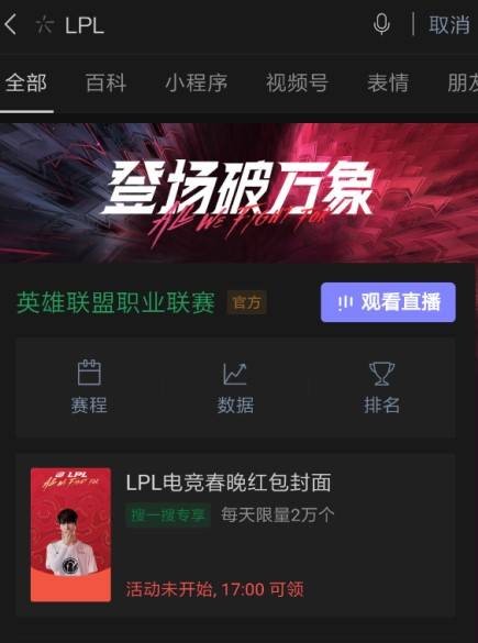 2月5日起,关注微信公众号 英雄联盟职业联赛 领取。 2月5日起,点击菜单“红包封面”即可进入领取。共计17个战队每个战队1款,以以及5款LPL特别主题红包封面。