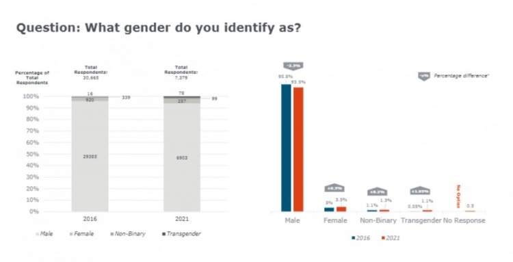 2016年 男性:95.8%,女性:3%,非二元性别:1.1%,变性者:0.05%,无回答:0%