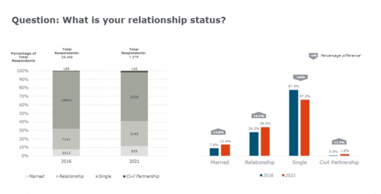 在感情状态上:单身的玩家依旧占据多数,但相比五年前还是有所下降。