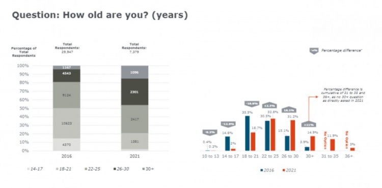 在年龄上:2016年14岁到30岁的人数占比高达95.7%,18-21岁的人群占据多数;而在2021年14岁到30岁的人数仅占84.7%,22-25岁的人数占据多数,而30岁以上的人群占比也比5年前高出了11%。