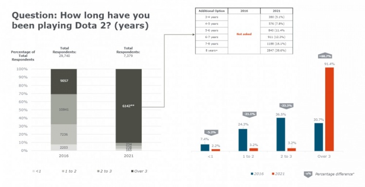 在游戏时长上:五年前玩至3年以上的玩家仅占30.7%,而在五年后占比高达91.4%
