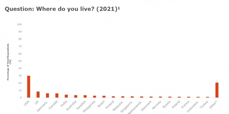 美国 30%,英国 8%,德国 5%,加拿大 5%,印度 4%,澳大利亚 4%,瑞典 4%,菲律宾 3%,巴西 3%, 芬兰 2%, 马来西亚 2%,新加坡 2%,荷兰 2%,丹麦 1%,挪威 1%,俄罗斯 1%,波兰 1%,法国 1%,印度尼西亚 1%,土耳其 1%,其他地区 20%(中国 0.2%左右)