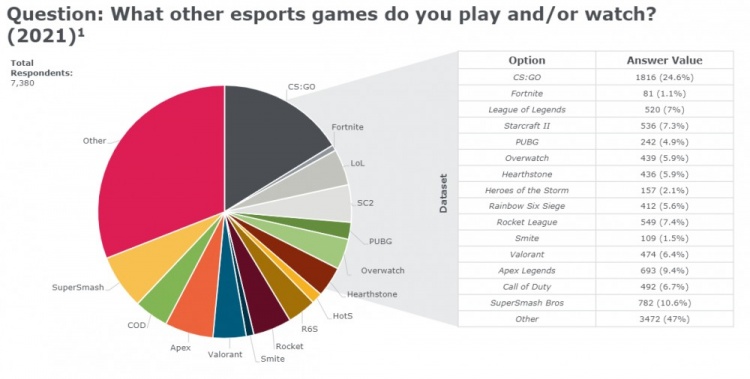 CS:GO 24.6%,堡垒之夜 1.1%,英雄联盟 7%,星际争霸2 7.3%,PUBG 4.9%,守望先锋 5.9%,炉石传说 5.9%,风暴英雄 2.1%,彩虹六号:围攻 5.6%,火箭联盟 7.4%,神之浩劫 1.5%,无畏契约 6.4%,Apex 9.4%,COD 6.7,%,任天堂明星大乱斗 10.6%,其他 47%