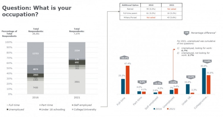 2021年 全职 47.4%,临时工 4.1%,个体户 4.3%,没工作 9.4%,18岁以下 2.3%,上学 31.6%
