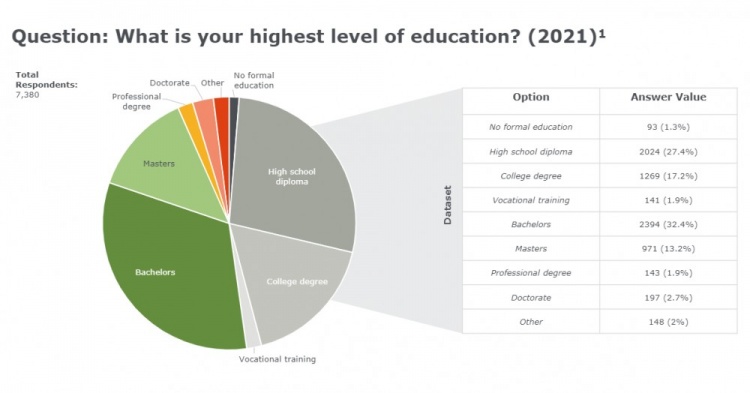 没受过正规教育 1.3%,高中毕业 27.4%,大专毕业 17.2%,职业教育 1.9%,学士学位 32.4%,硕士毕业 13.2%,专业硕士毕业 1.9%,博士毕业 2.7%,其他 2%