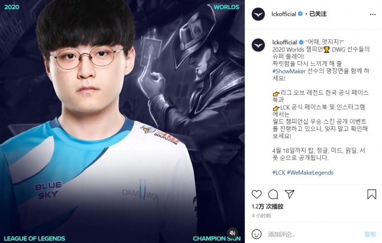 直播吧4月16日讯 今日LCK官方INS发布一段DWG.Showmaker选手在2020世界赛上使用卡牌的高光时刻,为冠军皮肤预热。(继DWG与KIA合作并更名为DWG KIA之后,队伍简称也由DWG改为DK。)
