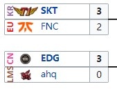 而T1在小组赛取得的了统治性的战绩,5-0全胜进入下一轮对阵FNC,EDG小组赛4-1下一轮对阵AHQ,而TSM和黑鹰分别以1-4和0-5的成绩遭到淘汰