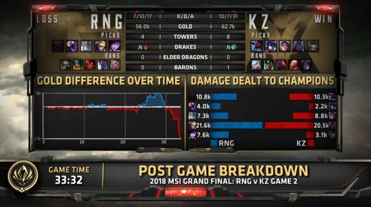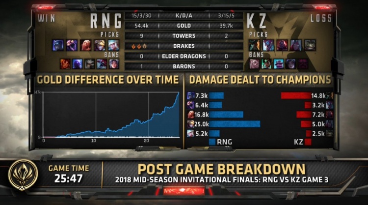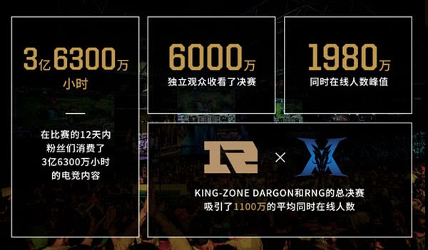 在12天比赛日程中,全球观众一共消费了3亿6300万小时的电竞内容;同时观看人数峰值达到了1980万的高度。一共有6000万名独立观众收看了KING-ZONG DARGON与RNG之间的总决赛,总决赛的平均观看人数也达到了1100万人的水平,2018季中冠军赛成为了有史以来收看人数最多的一届季中冠军赛。