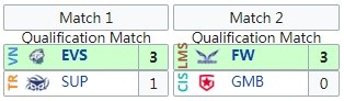 (本轮由从淘汰赛晋级的两支队伍随机匹配EVS和FW,进行BO5对局,胜者获得小组赛阶段参赛名额,本轮EVS、FW成功晋级)