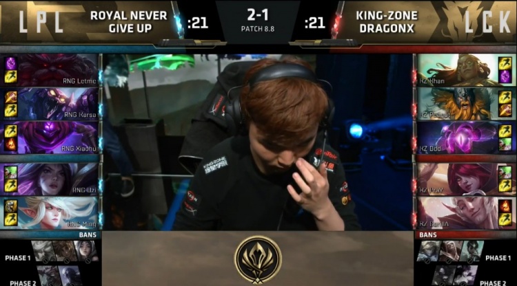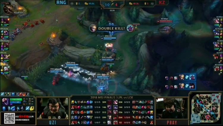 第一局,RNG上中选出双恩,上路一波“khan在送!他在送!活了送,死了传,传了再送!”RNG取得巨大优势。
