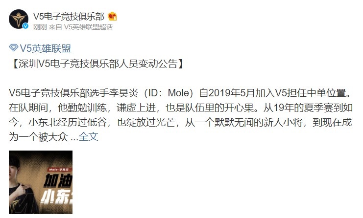 经与选手、俱乐部三方的友好沟通洽谈,V5电子竞技俱乐部英雄联盟分部选手李昊炎(ID:Mole)即日起将转会至@WE电子竞技俱乐部