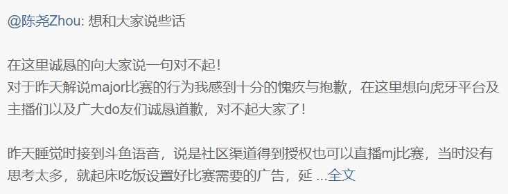 昨天睡觉时接到斗鱼语音,说是社区渠道得到授权也可以直播mj比赛,当时没有思考太多,就起床吃饭设置好比赛需要的广告,延迟等等,7点开播。因为之前一直看不了中外对抗的比赛,听到有授权可以看比赛,就也想着能播就播。但是由于自己认知的不足,也没有考虑得十分清楚,忽视了其他人的感受与权益,对虎牙,粉丝,dota2社区造成了不好的影响,再次诚恳的向各位道歉,十分对不起!