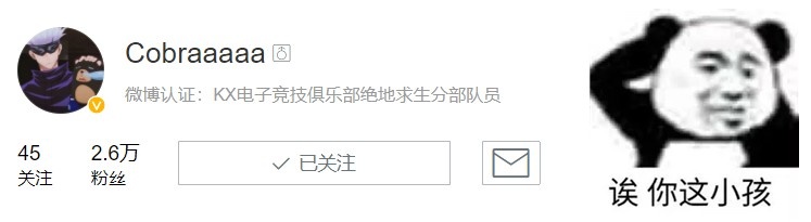 Cobra曾为PUBG(绝地求生)职业战队KX的职业选手,Cobra选手春季赛最后一场还在为队伍效力,转眼间却成了最后的惊鸿一声;只能说需要尊重选手的选择,也希望其在学业上收获自己的天地;