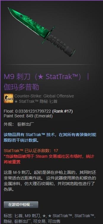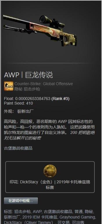 而后就是应该被大众最为所知的皮肤之一,AWP巨龙传说而Jackey的这把据说是世界第三的磨损。市场估价15W左右。