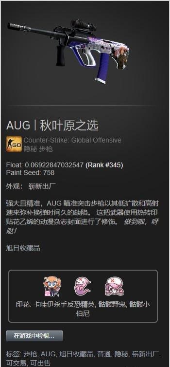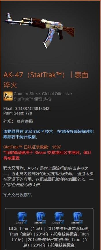 4TT暗金略磨淬火,Titan是CSGO中最为值钱的枪械贴纸,市场价28W一张(算成交记录)而Jackey这把连续4张。而表面淬火这个皮肤比较玄学,喜欢的人非常喜欢,不喜欢的就无感但是Jackey这把蓝弹夹的AK市场估价大概在70W左右。