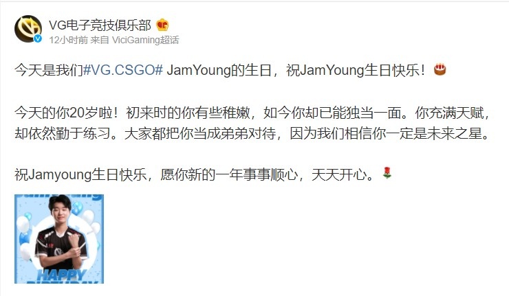 微博原文如下:今天是我们VG.CSGO JamYoung的生日,祝JamYoung生日快乐!