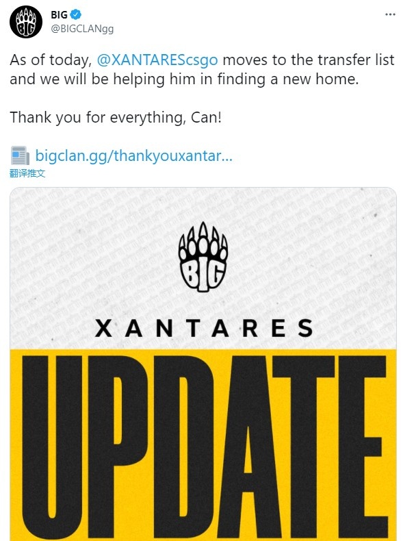 直播吧8月2日讯 今日CSGO的BIG战队在推特上官宣,将旗下明星选手XANTARES转移到转会名单上。在长达两年半的合作后,这位土耳其巨星与BIG的合作即将结束,为队伍的新成员gade让路。XANTARES于2018年年底加入BIG,他与tabseN和tiziaN三人为核心的阵容在经历多次变阵之后依旧是队伍的中流砥柱。