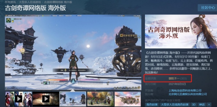 直播吧8月5日讯《古剑奇谭网络版 海外版》国区中文版已经登陆Steam平台,目前游戏三百多条评价中55%好评,“褒贬不一”,差评的原因大多是明明叫了“海外版”,但却仅限国区,海外玩家不能享受“海外版”,而真正的海外版《Swords of Legends Online》无中文。
