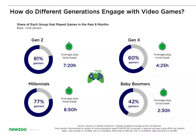 在我们的年度消费者洞察研究中,我们调研了33个国家/市场中的72000人,大约81%的Z世代游戏玩家回复说在过去六个月里玩过游戏,平均每周游戏时间为7小时20分钟。