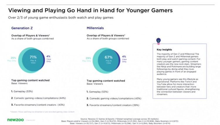 大多数年轻一代游戏玩家观看与游戏相关的内容(分别占 Z 世代和千禧一代游戏玩家的 75% 和 71%)。玩的人和看的人之间的重合度自然是巨大的: