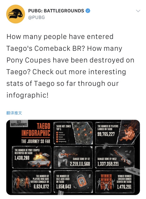 直播吧9月4日讯 近日绝地求生官方统计了游戏中的许多趣味数据,跳伞人次近1亿,两把新武器造成的伤害近35亿。