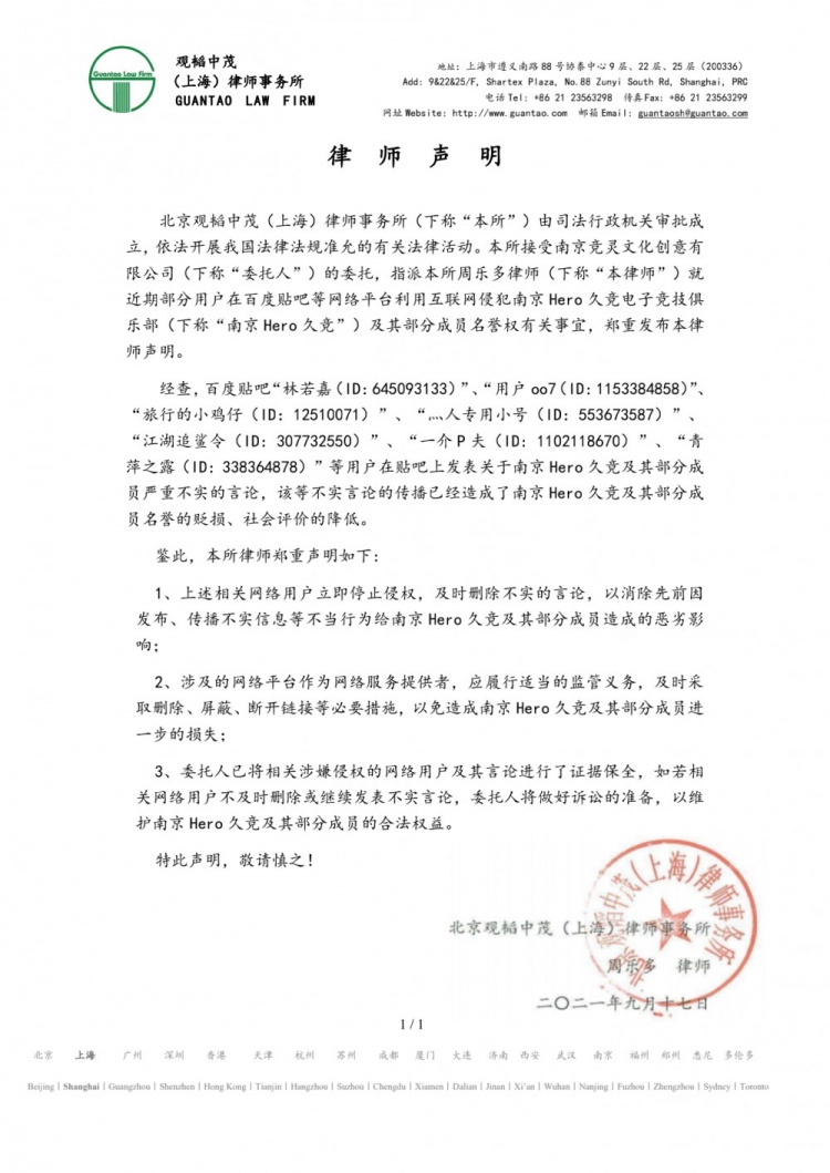 直播吧9月17日讯 刚刚南京Hero久竞在微博上发布了维权声明,针对网络上流传关于造谣抹黑俱乐部的行为已采取法律措施来维护自身权益。