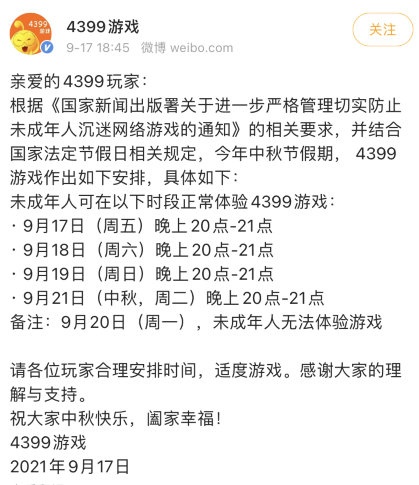 4399官方也在昨日发布了防止未成年人沉迷网络游戏的具体通知,规定中秋假期未成年人仅每日可游玩一小时。
