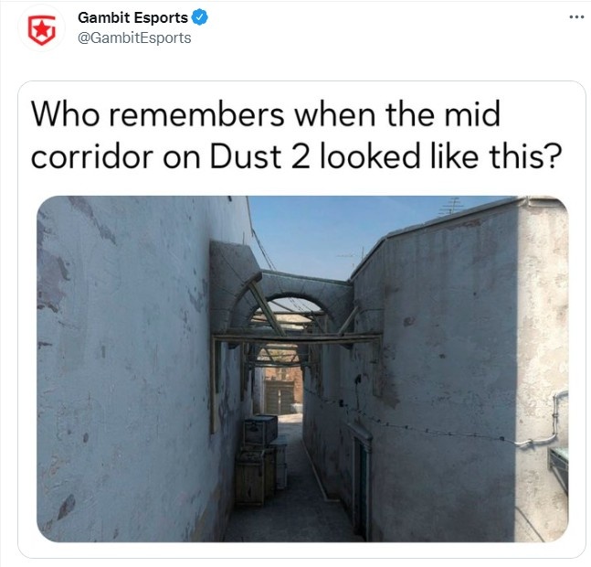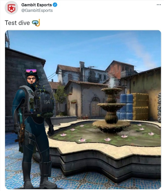 Gambit则连发两个推特,一张是泳装探员在Inferno的喷泉旁,并配文:试试在喷泉潜水吧!第二张则为:谁还会记得Dust 2中路走廊是这样的?