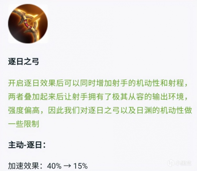 但是,在之前版本中,逐日之弓也遭到了不小的削弱,加速效果由40%降低到了15%,持续5秒钟。