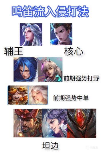 首先打野和中单要用足够强势的,越强势越好,比如打野橘右京、云中君、盘古、裴擒虎等,中路选沈梦溪、嫦娥、周瑜前期战斗能力过得去的(当然你要是自信的话,用其他的也行),边路要选择一个坦边。