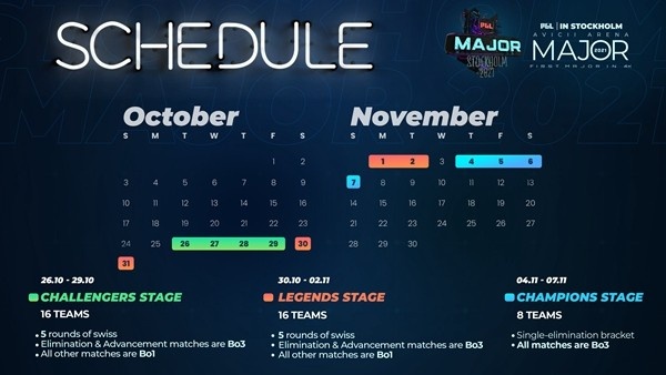 PGL 斯德哥尔摩Major将在10月26日至11月7日展开。本次赛事将分为三个阶段:挑战者组阶段、传奇组阶段、冠军组阶段。每个阶段都是四天,24支队伍将在瑞典决出今年的Major冠军,比赛的总奖金池高达200万美元。