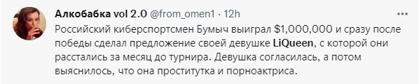“俄罗斯电竞选手boombl4赢得了100万美元的奖金,并在比赛前一个月向女友LiQueen求婚。女孩答应了,结果发现她是个妓女和色情演员。”