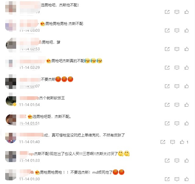 随后EDG上单选手Flandre圣枪哥的夺冠皮肤选什么的微博底下,一堆网友一转风向直呼:圣枪哥别选杰斯皮肤,他不配!(圣枪哥在本次世界赛决赛第三局中使用了杰斯)