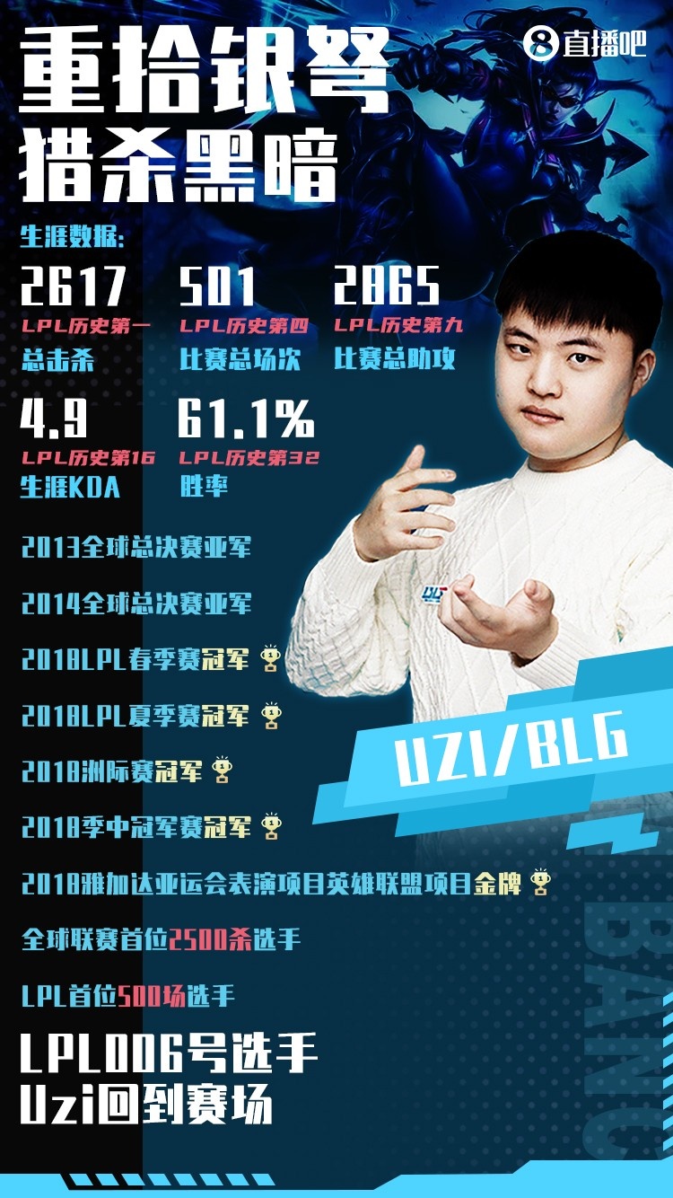 直播吧12月15日讯 今日BLG战队通过直播的方式正式宣布:前亚运会冠军、LPL传奇选手——UZI正式复出加盟BLG。直播吧也特此制作海报庆祝UZI选手的回归,愿Uzi选手新的赛季能够以神明之躯,猎杀不敬之徒。