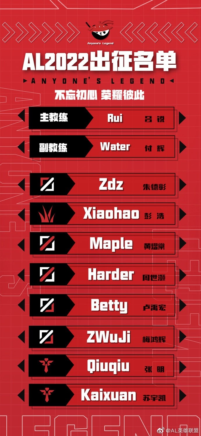 直播吧12月15日讯 今日AL战队(原RW)宣布2022年LPL出征单名单,上单Zdz,打野Xiaohao,中路Maple、Harder,下路Betty、ZWuJi,辅助Qiuqiu、Kaixuan。