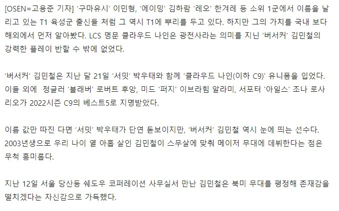 直播吧12月15日讯 此前C9官宣了新赛季大名单,前T1青训队的下路选手Berserker来到了北美作战;近日Berserker选手接受了韩媒的采访,在采访过程中Berserker选手表示: