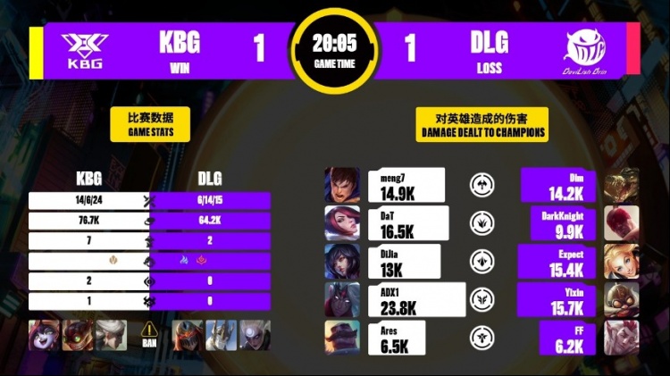 第一局比赛DLG战队在BP环节成功拿下热门打野武器大师,加之中路璐璐与辅助布隆的双重保护,打野选手DarkKnight从开局就主宰了本场比赛的节奏,以一波中路一换三锁定胜局拿下首场比赛的胜利。在首局失利的情况下,第二场比赛KBG战队选手DiJia的狐狸发挥神勇。在DLG率先开团的情况下强势反击拿下双杀,通过团队的默契配合取得胜利将比分扳为1-1平。