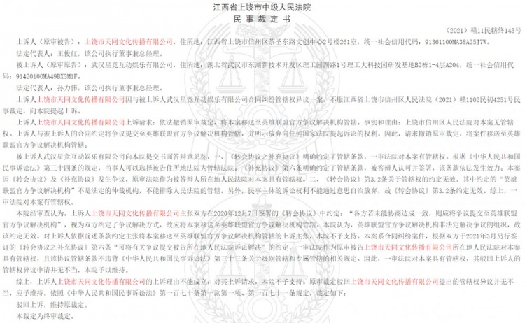 在去年11月25日,上饶市中级人民法院发布双方公司民事裁定书,RNG母公司上诉主张将本案移送至英雄联盟官方争议解决机构管辖,但被上饶法院以:英雄联盟官方争议解决机构非法定解决争议的组织理由驳回上诉申请并终审裁定。